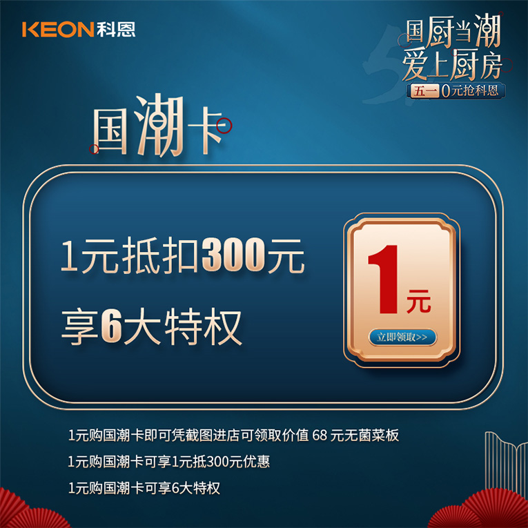 1元國潮卡,限時搶購!購買1元國潮卡,憑截圖即可進店領取價值68元無菌菜板、1元抵300元優(yōu)惠,同時,可享六大特權!