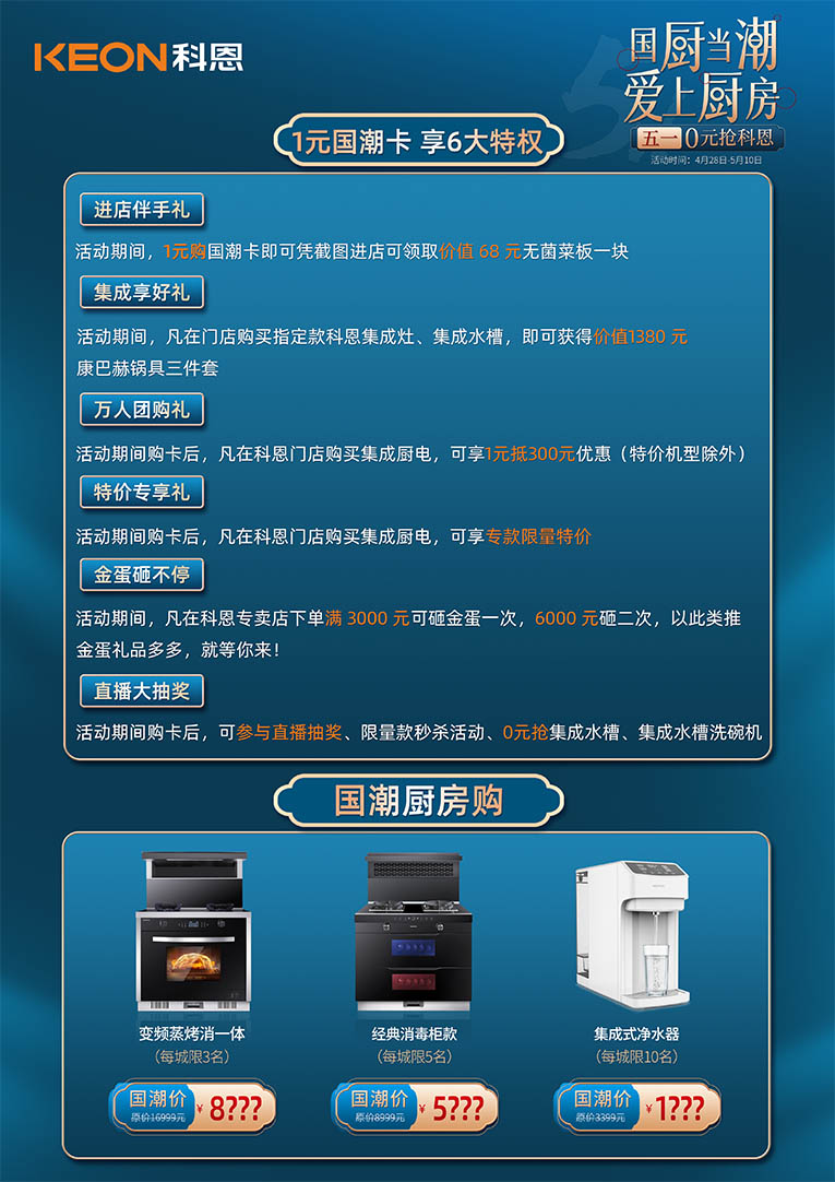 五一黃金周來臨,為了讓千萬家庭享受“廚房新國潮科恩新三件”帶來的魅力,科恩集成灶持續(xù)發(fā)力,全國聯(lián)動擼起袖子,“國廚當潮,愛上廚房”五一0元搶科恩,4月28日-5月10日,進科恩集成灶全國門店,六大特權傾情放送!