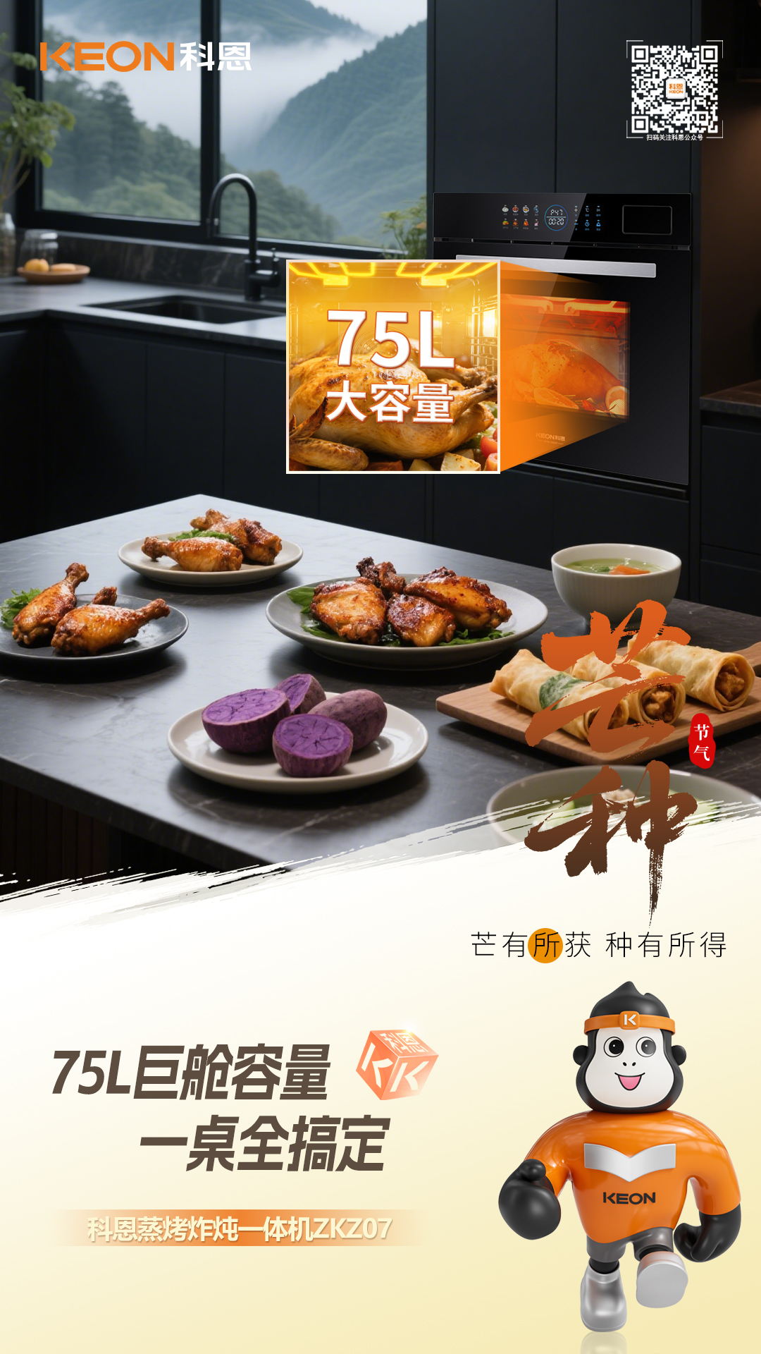 忙有所獲,種有所得。麥浪翻滾的芒種時節,廚房也該迎來全新蛻變,科恩以舊換新計劃,讓升級變得更簡單。選擇ZKZ07蒸烤炸燉一體機, 就是選擇品質生活,讓這個收獲的季節 給生活多一重美味維度!