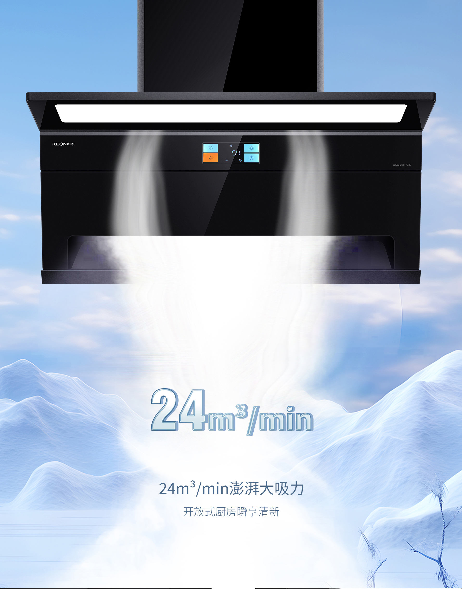 24m³/min颶風吸力+1000Pa風壓,低位側吸,鎖定升騰油煙;高位頂吸,攔截逃逸余煙;開放式廚房也能瞬享清新。120°天鵝頸設計掀起空間革命,2cm超薄機身釋放臺面空間,從此顛勺不碰頭,烹飪自如,科恩7730煙機重新定義凈煙美學。