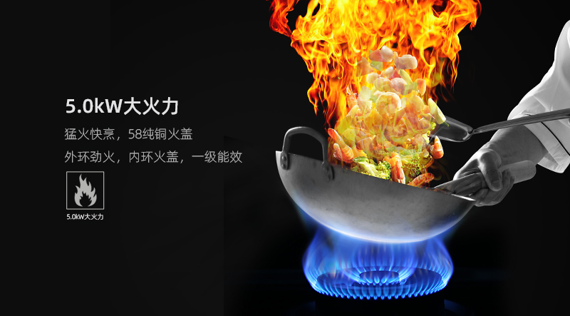 5.0kW大火力猛火快烹,58純銅火蓋,鋁合金瓷化爐頭,上進風四通道進氣