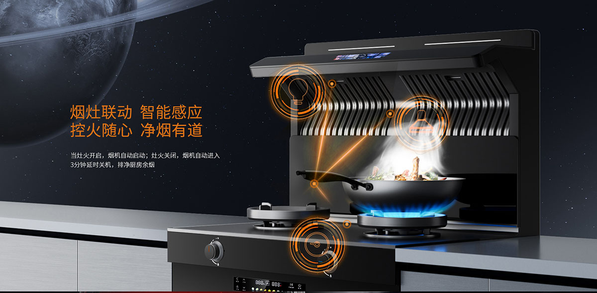 煙灶聯(lián)動(dòng),點(diǎn)火煙機(jī)及照明燈自動(dòng)開啟;三分鐘延時(shí),自動(dòng)掃除殘留煙油