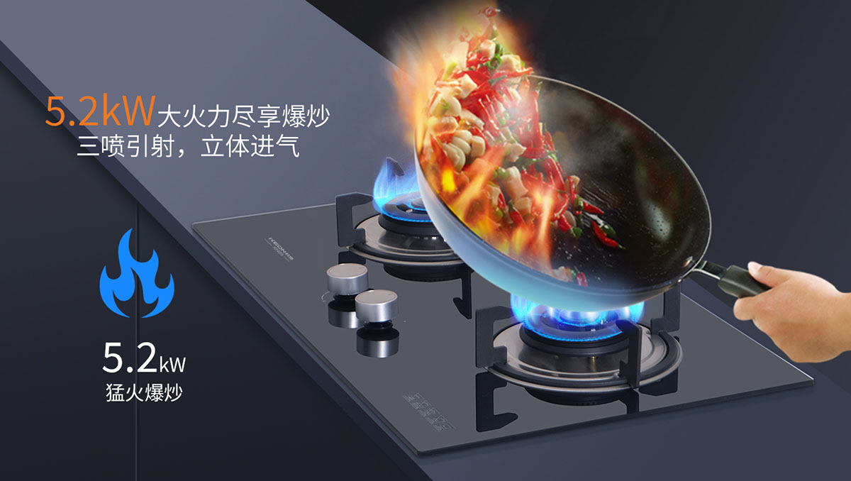- 三噴引射,立體進(jìn)氣,5.2kW大火力盡享爆炒